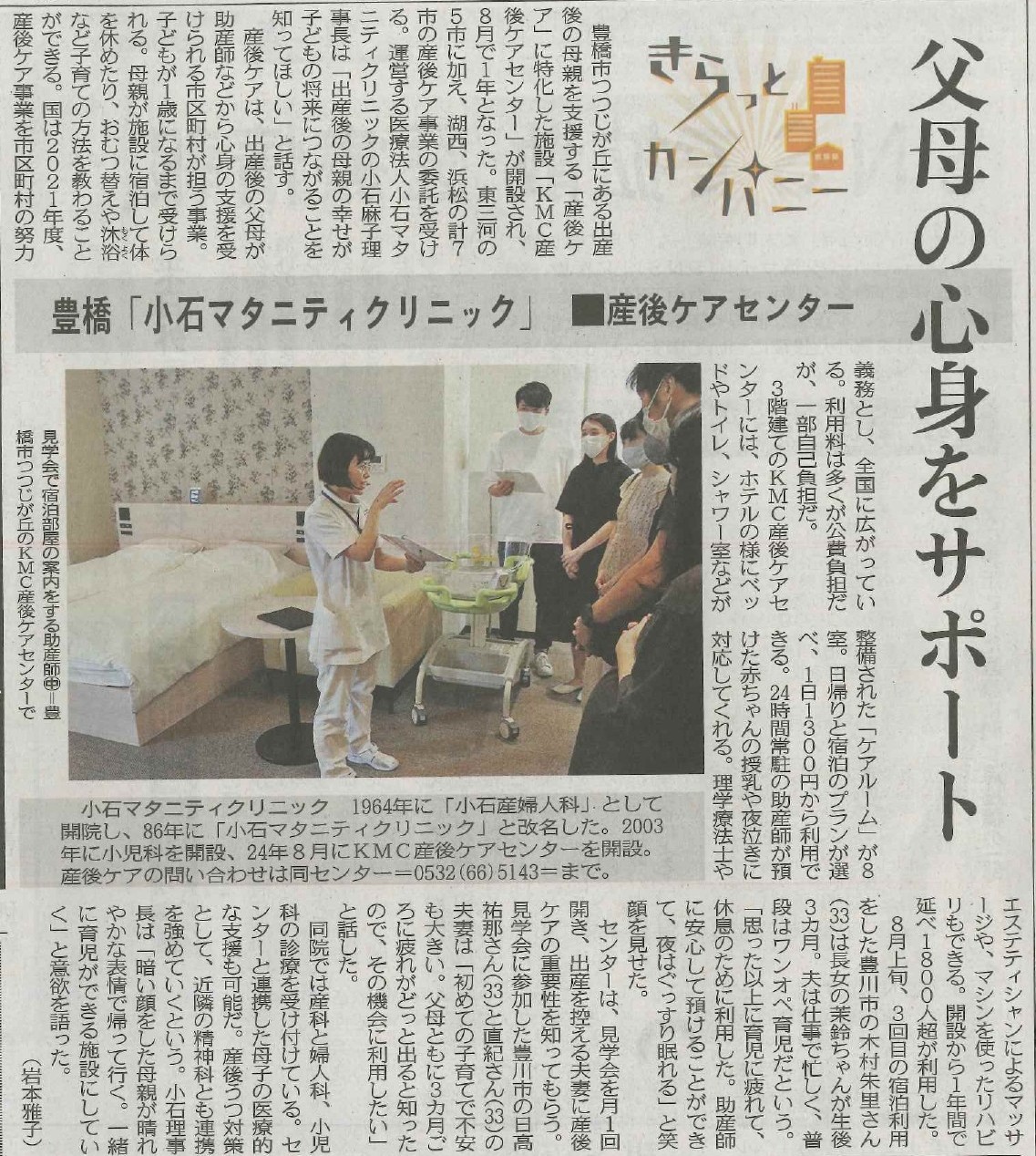 マタニティ / ウィメンズ / 産後ケア 2025.9.8 「中日新聞」にKMC産後ケアセンターが掲載されました メディア KMC産後ケアセンター1周年の記事が「中日新聞」に掲載されました。 お知らせ一覧へ 前のお知らせ 次のお知らせ